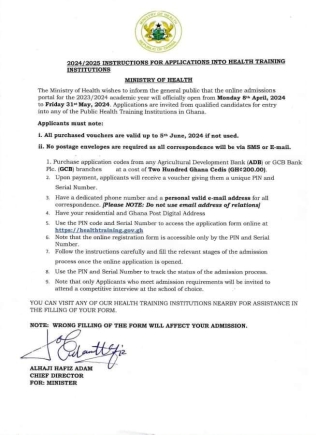 The Ministry of Health has released instructions for prospective applicants seeking admission into health training institutions for the 2024/2025 academic year.
