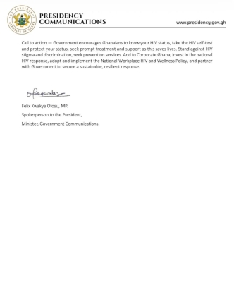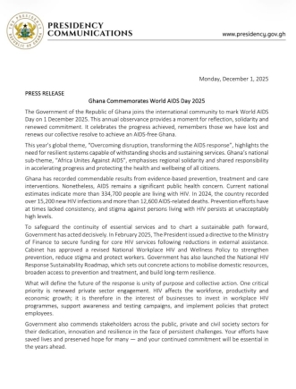 In a statement issued by the Minister of Government Communications, Felix Kwakye Ofosu to mark World Aids Day, he indicated that despite progress made through evidence-based prevention, treatment and care, stigma and inconsistent adherence to interventions continue to hinder efforts, leaving many Ghanaians vulnerable.