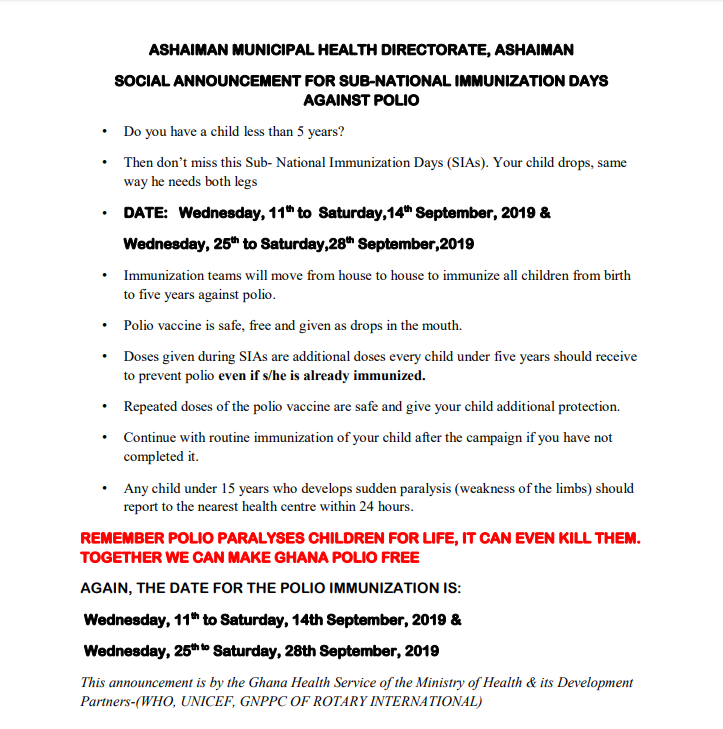 The Ghana Health Service (GHS) has announced that it will commence immunizing children aged under five years against polio tomorrow (September 11, 2019).