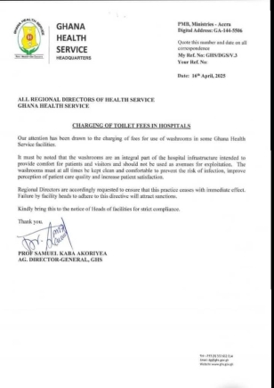 The practice has gradually extended to many health facilities, following which the Ghana Health Service (GHS) in a circular to all regional directors, has noted that its attention has been drawn to the charging of fees for use of washrooms in some Ghana Health Service facilities.