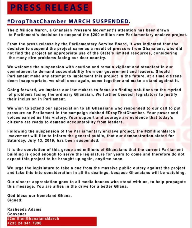 The group had planned to hit the streets on Saturday, July 13, 2019, but following latest developments with an announcement that Parliament was suspending the project due to public disagreement, it has served notice to discontinue the street protest.
