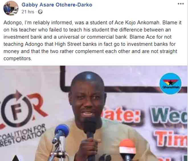However, Mr Otchere-Darko, nephew of President Nana Akufo-Addo, posted a reaction to Mr Adongo on Facebook on Thursday, 2 August 2018, stating: “Adongo, I’m reliably informed, was a student of Ace Kojo Ankomah. Blame it on his teacher who failed to teach his student the difference between an investment bank and a universal or commercial bank. Blame Ace for not teaching Adongo that High Street banks, in fact, go to investment banks for money and that the two rather complement each other and are not straight competitors”.