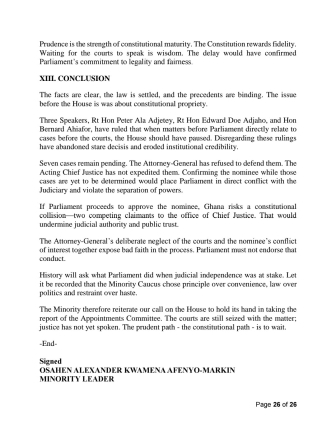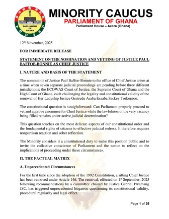 The Minority, led by Alexander Afenyo-Markin, announced its decision to boycott the process, insisting that the nomination itself is illegitimate because of unresolved legal challenges relating to the removal of former Chief Justice Gertrude Araba Esaaba Sackey Torkornoo.