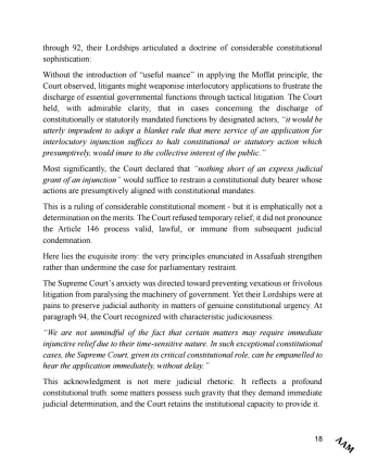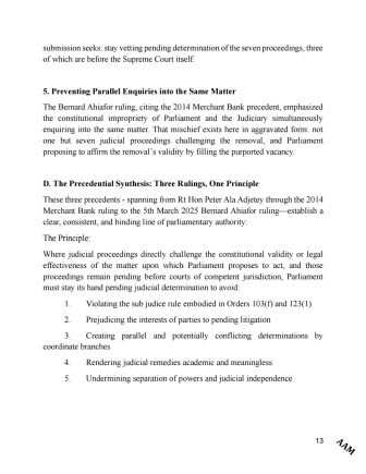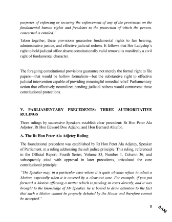 The second provision stipulates that the conduct of the Speaker, the Chief Justice, members, and the Superior Court of Judicature shall not be raised in Parliament except by a subordinate motion.