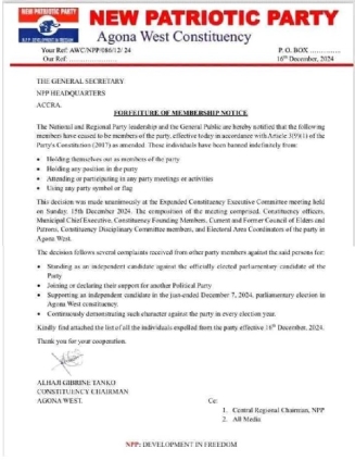 The letter formally notified the expelled members and the national office of the NPP that they are no longer recognised as members of the party and are barred from holding party positions, participating in party activities, or using its symbols and flag.