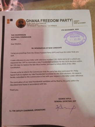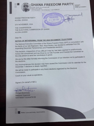 While the General Secretary of the GFP, George Afful in a letter dated Monday, November 4, 2024 addressed to the Electoral Commissioner announced that, the party has nominated the vice presidential candidate, Philip Appiah Kubi, commonly known as 'Roman Fada' to replace the late Akua Donkor as the Presidential candidate, the National Organiser, Richard Botchway in another letter dated Tuesday, November 5, 2024 also addressed to the EC announced that the party was withdrawing from the race.