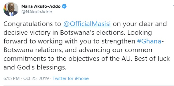 President Nana Addo Dankwa Akufo-Addo has congratulated the President of Botswana, Dr. Mokgweetsi E.K Masisi, following his re-election on Wednesday, October 23.