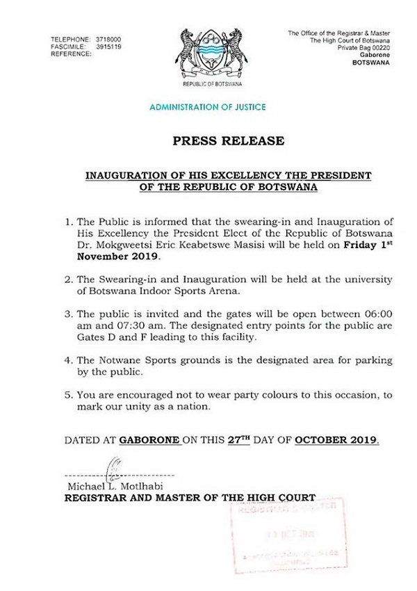 In a press release from the Republic of Botswana posted on twitter stated that the swearing-in and inauguration of His Excellency the President-Elect of the Republic of Botswana Dr. Mokgweetsi E.K Masisi will be held on Friday November 1, 2019.