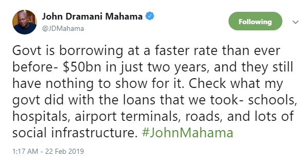 According to Mr Mahama who lost the 2016 Presidential elections to Akufo-Addo, the government is engaged in historic levels of borrowing but has nothing to show for it.