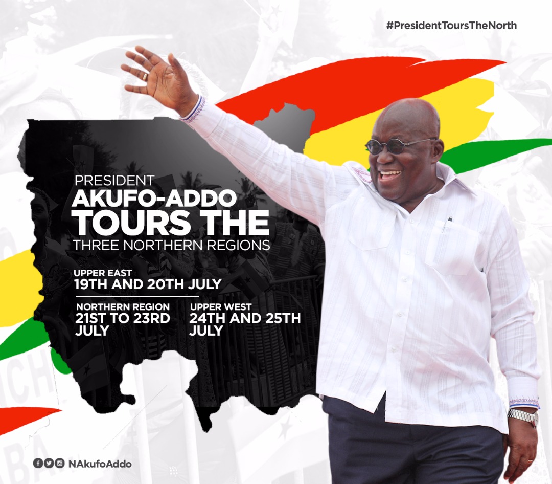 President Nana Addo Dankwa Akufo-Addo, will from Thursday, July 19 to Wednesday, July 25, 2018, embark on a 7-day tour of the Northern, Upper East and Upper West regions.