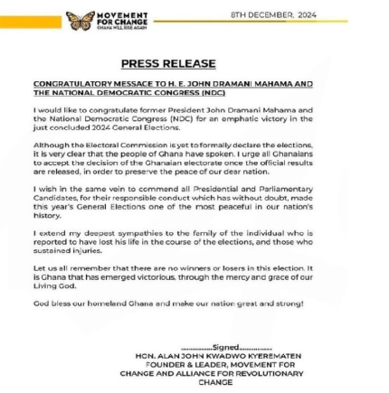 Founder and leader of the Movement for Change and Alliance for Revolutionary Change, Alan John Kwadwo Kyerematen, has extended his congratulations to former President John Dramani Mahama and the National Democratic Congress (NDC) on their success in the 2024 elections.