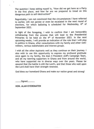 "In light of the foregoing, I wish to confirm that I am honourably withdrawing from the process that will lead to the Presidential Primaries to be held on the 4th of November 2023. In the next upcoming weeks, I will provide an indication of the role that I will play in politics in Ghana, after consultations with my family and other well-wishers, various stakeholders and interest groups.
