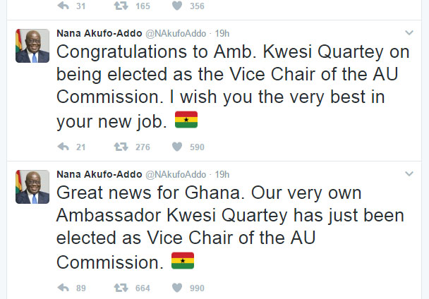 “Congratulations to Amb. Kwesi Quartey on being elected as the Vice Chair of the AU Commission. I iwsh you the very best in your new job.”