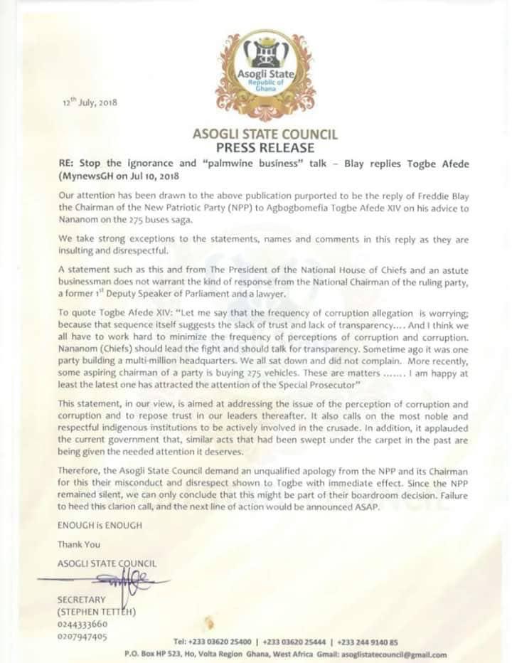 The Asogli State Council is demanding an apology from the governing New Patriotic Party (NPP) and its National Chairman, Freddie Blay, for what it described as an “insulting and disrespecting” statement against Togbe Afede XIV, the Agbogbomefia of the Asogli State and President of the National House of Chiefs.