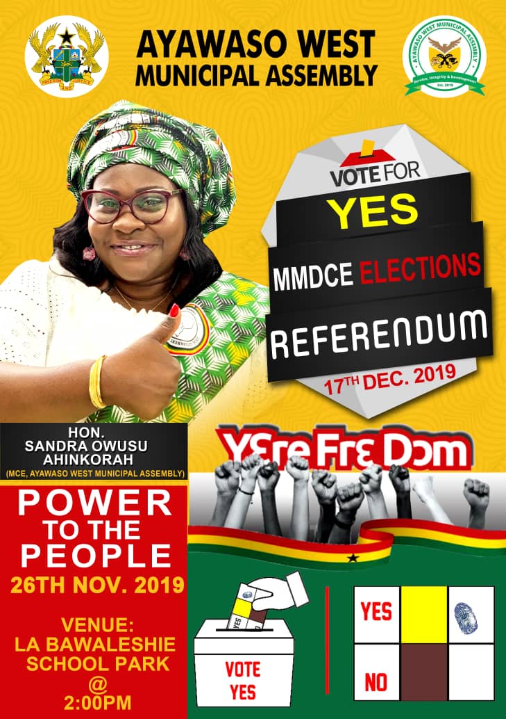 The Municipal Chief Executive (MCE) of the Ayawaso West Municipal Assembly, Mrs Sandra Owusu Ahinkorah will on Tuesday, November 26, host a durbar for residents of the Assembly to deliberate on the 'December 17 Referendum'.