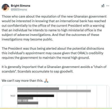 "Those who care about the reputation of the new Ghanaian government would be interested in knowing that an international bank has reached out confidentially to the office of the current President with a warning that an individual he intends to name to high ministerial office is the subject of adverse investigations. And that the outcomes of these investigations may become public. The President was thus being alerted about the potential distractions this individual's appointment may cause given that ORAL's credibility requires the government to maintain the moral high ground. It is generally important that a Ghanaian government avoids a "chain of scandals". Scandals accumulate to sap goodwill. We can't say more than this," he stated.