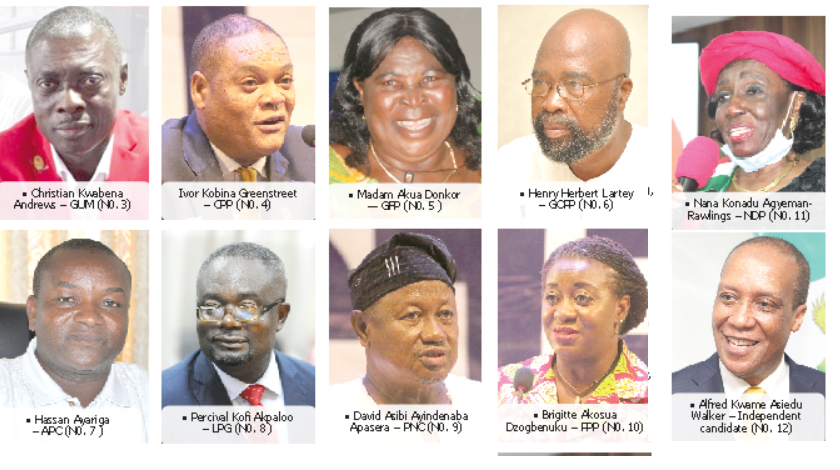 The flag bearer of the Liberal Party of Ghana (LPG), Mr Kofi Apaloo; Mr David Apasera of the People’s National Convention (PNC), Ms Brigitte Dzogbenuku of the Progressive People’s Party (PPP) and Nana Konadu Agyeman Rawlings of the National Democratic Party (NDP) secured the eighth, ninth, 10th and 11th spots, respectively, on the ballot paper.