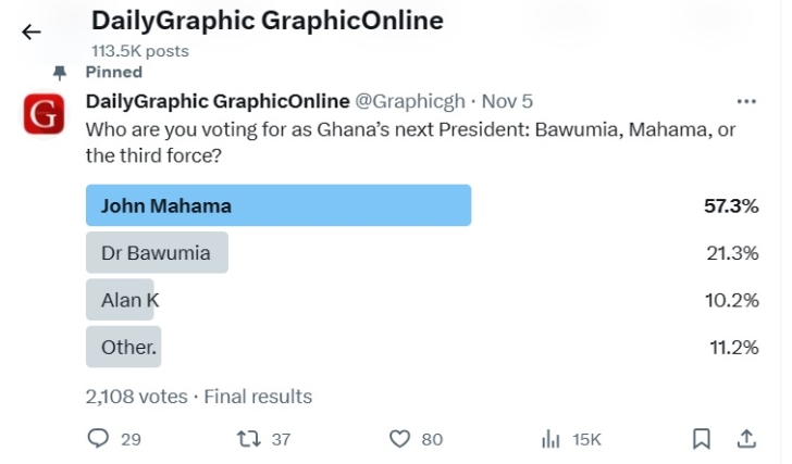 Graphic Online put up a 24-hour poll on Twitter [@Graphicgh] from 6pm on Sunday (November 5, 2023) to 6pm on Monday, November 6, 2023 and this is how 'netizens' voted.