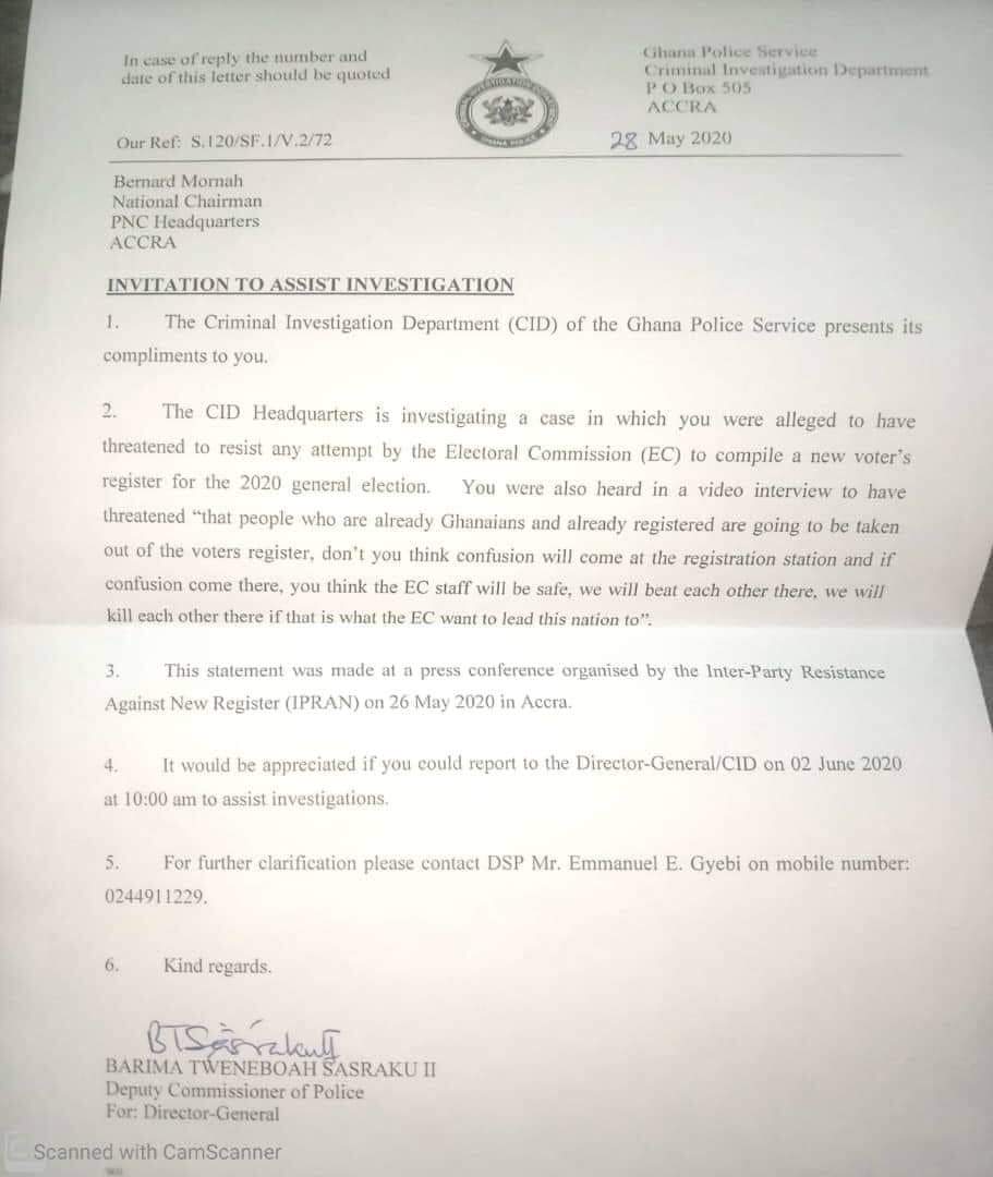 The Criminal Investigations Department (CID) of the Ghana Police Service has invited Mr Mornah to assist with an investigation it is conducting into an allegation of threat against the EC, should it decide to go ahead with the compilation of a new voter's register in late June 2020.