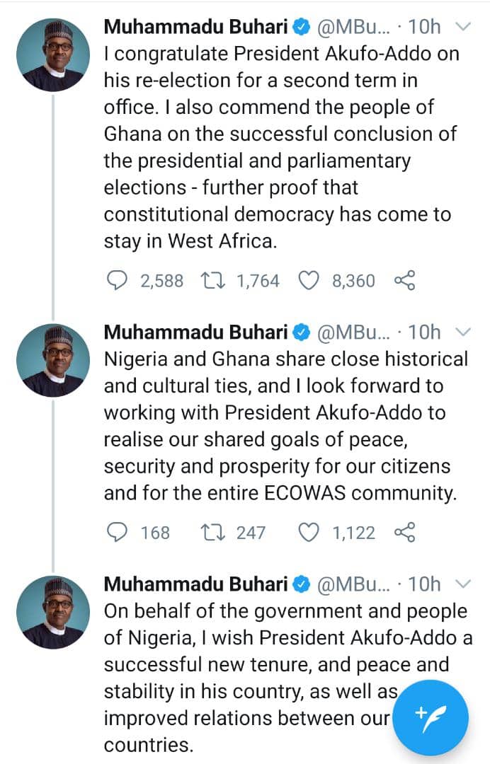 In a tweet, Buhari wrote: " I congratulate President Akufo-Addo on his re-election for a second term in office. I also commend the people of Ghana on the successful conclusion of the presidential and parliamentary elections - further proof that constitutional democracy has come to stay in West Africa."
