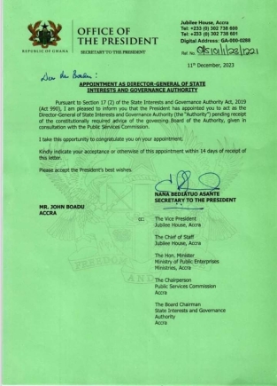 Mr John Boadu's appointment was announced in a letter dated Monday, December 11, 2023 signed by the Secretary to the President, Nana Bediatuo Asante.