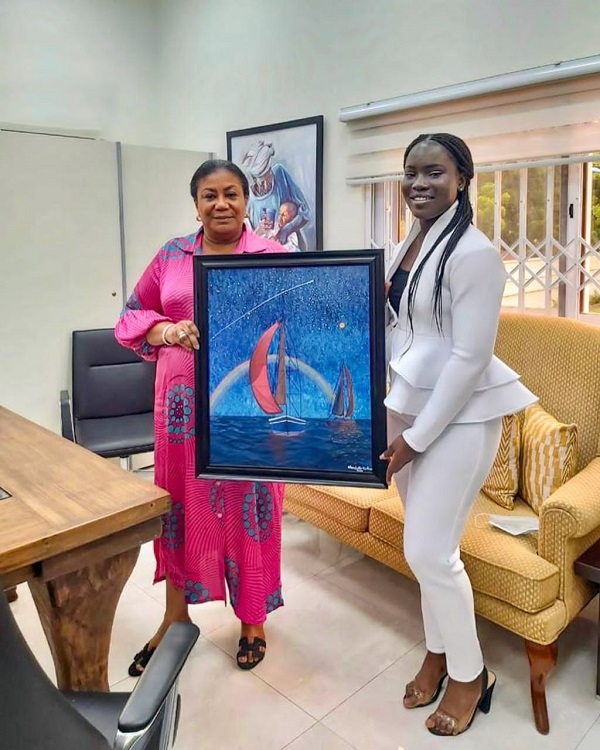 The First Lady, Mrs Rebecca Akufo- Addo (left) receiving an artwork from Miss Chantelle Eghan. Ms Caroline Indoom, an aunt of Mrs Akufo-Addo commissioned Chantelle to make this piece