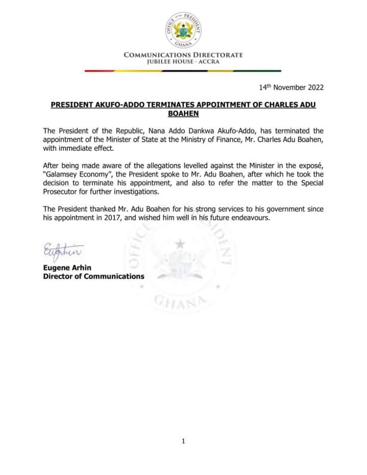 After being made aware of the allegations levelled against the Minister in the exposé "Galamsey Economy", the President spoke to Mr. Adu Boahen, after which he took the decision to terminate his appointment, and also to refer the matter to the Special Prosecutor for further investigations.