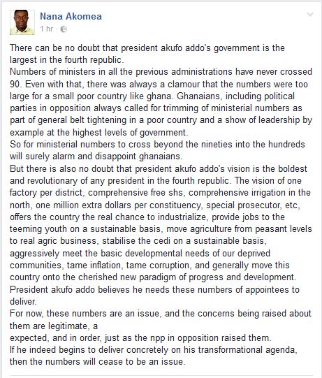 The Communications Director of the governing New Patriotic Party (NPP), Nana Akomea, has described concerns about the number of ministerial appointments in President Akufo-Addo’s government as legitimate and in order.