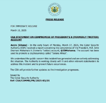 In a statement released on March 18, 2025, the CSA revealed that the breach occurred in the early hours of March 17, with hackers gaining unauthorised access to the President’s account and using it to promote a fraudulent cryptocurrency scheme known as "Solana Africa."