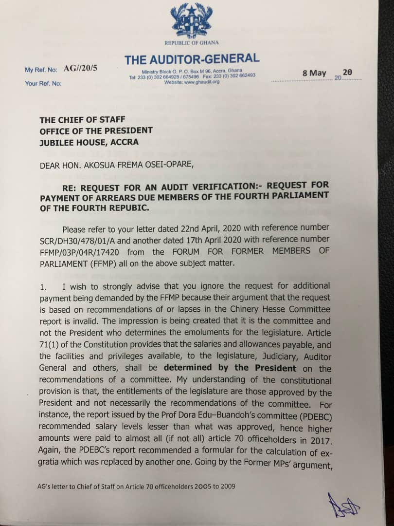 However, the Auditor-General, Mr Daniel Yaw Domelevo in a response letter dated May 8, 2020, declined to carry out the audit verification and said they [former MPs] were not entitled to the said arrears and that it was an "invalid" request.
