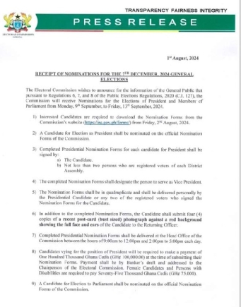 From Friday, August 2, 2024, interested candidates in the upcoming December 7, 2024 presidential and parliamentary elections, can download nomination forms from the Electoral Commission's (EC) website and start filling them for filing.