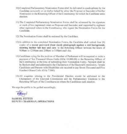 "All enquiries relating to the Presidential Election should be addressed to the Chairperson of the Electoral Commission and the Parliamentary Elections to the Returning Officers of the Constituencies where the Candidates seek election," it concluded.
