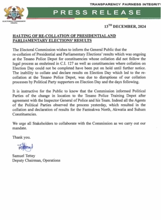 In the statement signed and issued on Friday [Dec 13, 2024] evening by Samuel Tettey, EC Deputy Chairman in Charge of Operations, the commission explained that those collation exercises "have been put on hold until further notice."