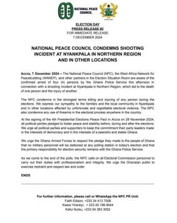 The National Peace Council (NPC) has strongly condemned a shooting incident in Nyankpala, Northern Region, during today’s (December 7) elections, which resulted in one death and left another person injured.