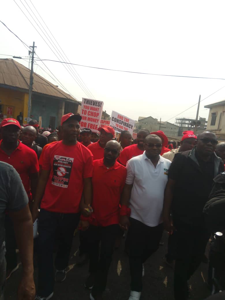 The protestors held placards some which read, "End conspiracy to rig the elections", "Thieves! You want to chop our money for free" and"Conspiracy to rig the upcoming elections exposed."