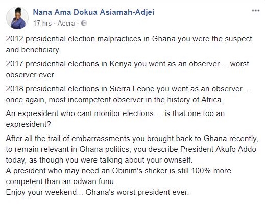 However, the Deputy Information Minister did not take kindly to his comments branding him "Ghana's worst president ever" in a post on Facebook.