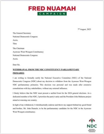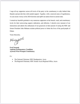 In a letter addressed to the General Secretary of the NDC and the Chairman of the Ayawaso West Wuogon Chairman of the party, Nuamah stated: "I firmly believe that the NDC must present a unified front for the 2024 general elections. As a dedicated member of the NDC, I prioritize the party’s unity and the President John Mahama project aimed at rescuing our country."