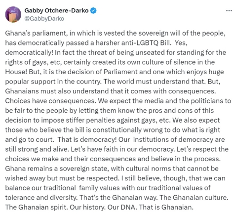 In a post on X (formerly Twitter), Otchere-Darko voiced apprehensions over what he labelled as a "harsher anti-LGBTQ Bill" and stressed the need for public education on its potential implications.