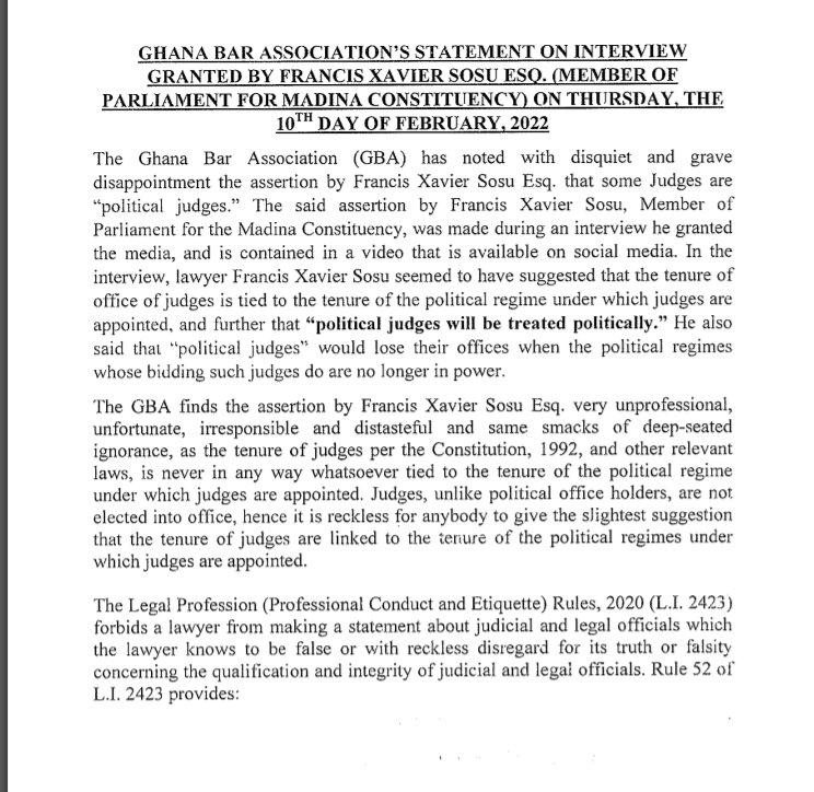 But a statement dated February 14, 2022, jointly signed by the National President and National Secretary of the GBA, Yaw Acheampong Boafo and Kwaku Gyau Baffour, condemned Mr Sosu, saying his statement “smacks of deep-seated ignorance, as the tenure of judges per the Constitution, 1992, and other relevant laws, is never in any way whatsoever tied to the tenure of the political regime under which judges are appointed”.
