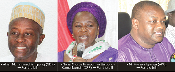 The parties in support of the bill are the National Democratic Congress (NDC), the Convention People’s Party (CPP), the National Democratic Party (NDP) and the All People’s Congress (APC), while the Liberal Party of Ghana (LPG) is opposed to the bill.
