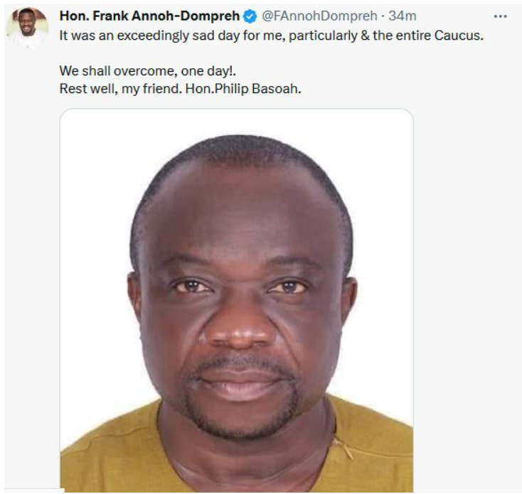 His death was confirmed by the Majority Chief Whip, Frank Annoh-Dompreh, in a tweet on Tuesday morning.