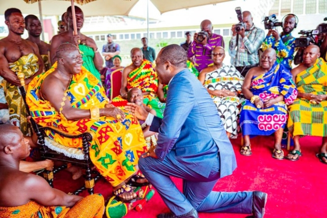 Mathew Opoku Prempeh, MP for Manhyia South, paying homage to the Asantehene, Otumfuo Osei Tutu II (seated), during a durbar at the Manhyia Palace in Kumasi