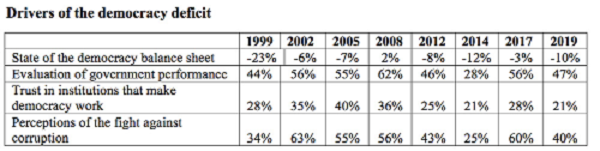 I observed the following: first, improvements in the evaluation of government performance corresponded with improvements in the democracy balance sheet. Further, in the first four rounds (1999, 2002, 2005, 2008), the changes in trust in institutions that make democracy work did not consistently correspond with changes in the democracy balance sheet. However, since Round 5 (2012) when trust improves, the democracy balance sheet improves. Finally, in the first four rounds (1999, 2002, 2005, 2008) the changes in perceptions of the fight against corruption did not consistently correspond with changes in the democracy balance sheet. However, from Round 5 (2012) when perception of the fight against corruption improves, the democracy balance sheet improves.