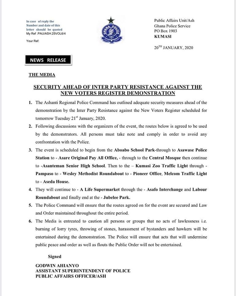 A statement signed and issued by the Ashanti Regional Police Public Relations Officer, ASP Mr Godwin Ahianyo explained that it has been agreed that the street protest will begin from the Aboabo School Park to the Asawase Police Station to Asare Original Pay All Office to the Central Mosque then continue to Asanteman Senior High School, then to the Kumasi Zoo Traffic Light through to Pampaso to Wesley Methodist Roundabout to Pioneer Office, Melcom Traffic Light to Aseda House.