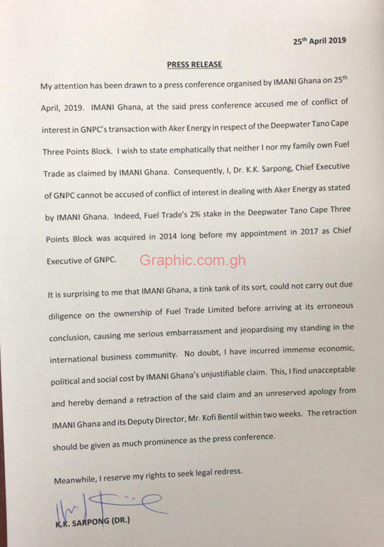 “Consequently, I, Dr. K.K. Sarpong, Chief Executive of GNPC cannot be accused of conflict of interest in dealing with Aker Energy as stated by IMANI Ghana.“