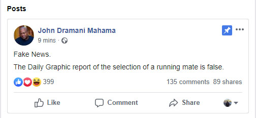 Meanwhile, Mr Mahama's Twitter handle has reacted to Graphic Online's report and described it as "Fake News."