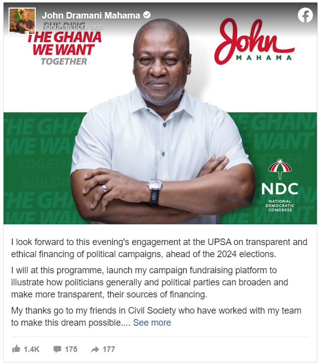 According to Mr. Mahama, the programme is to “illustrate how politicians generally and political parties can broaden and make more transparent, their sources of financing”.