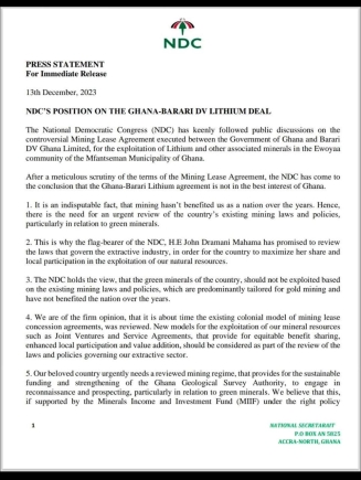 In a press statement released on December 13, 2023, the NDC stated that after careful examination of the terms of the Mining Lease Agreement, they concluded that the deal was not in the best interest of the country.