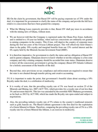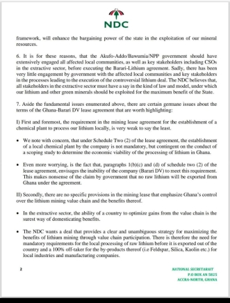 The NDC also raised concerns about specific provisions in the mining lease agreement, particularly regarding the establishment of a chemical plant to process lithium locally.