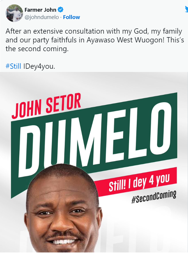 In a Tweet, Mr. Dumelo said after some consultation he has decided to stage a comeback.